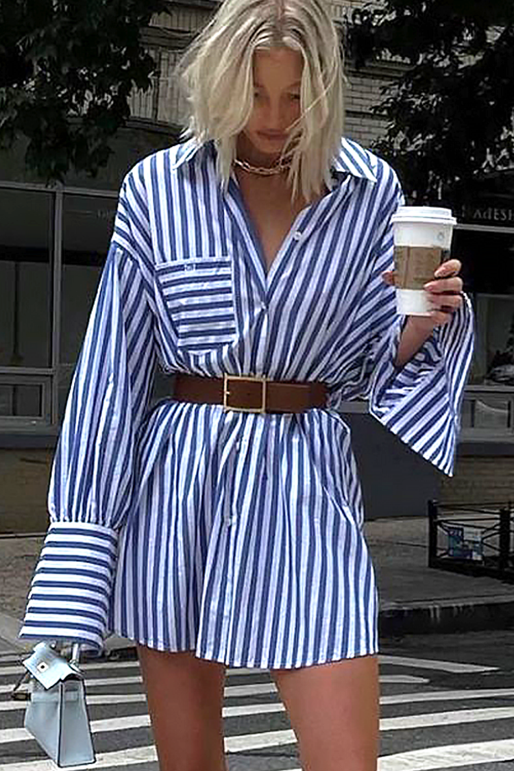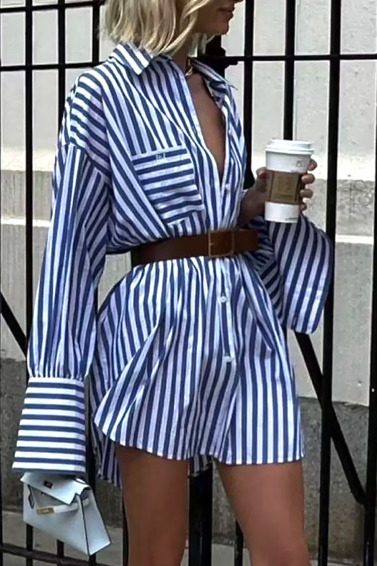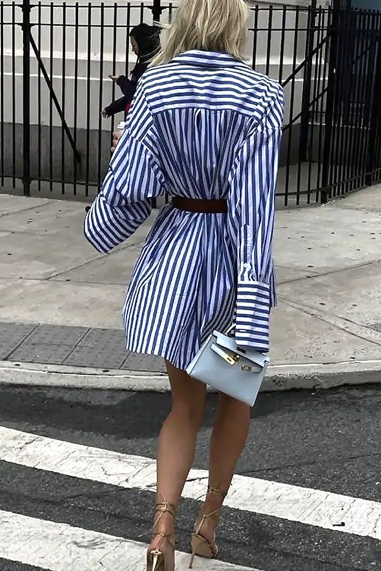 - Modelul are o lungime scurtă, croială lejeră, guler, nasturi și model in dungi.