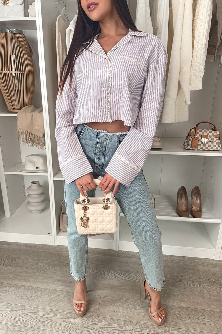 - Modelul are mâneci lungi, guler clasic, design cochet și o croială scurtă.