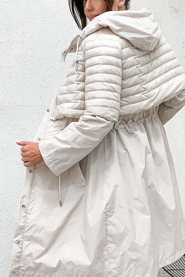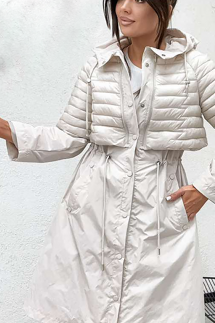 - Modelul are glugă, nasturi pe toată lungimea în față, o combinație de țesături impresionantă și buzunare laterale.