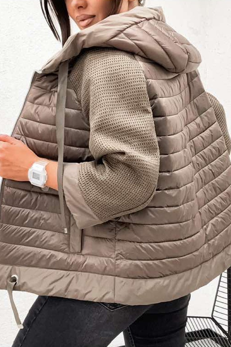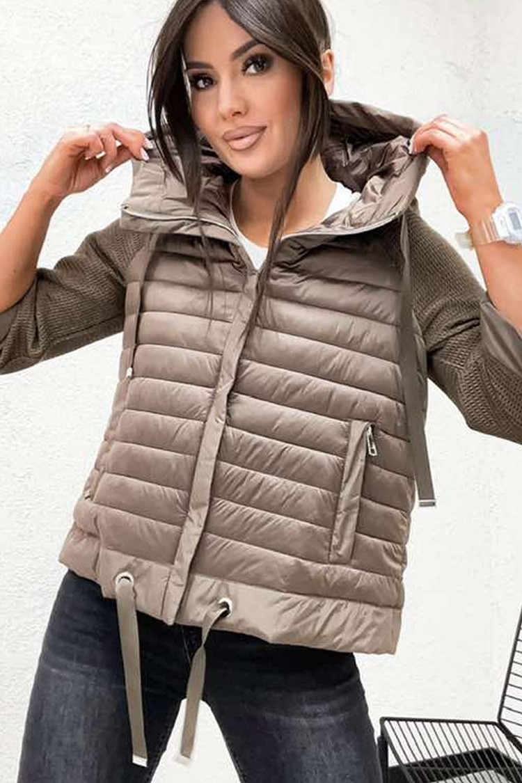 - Modelul are glugă, fermoar pe toată lungimea în față, o combinație spectaculoasă de materiale și buzunare laterale.