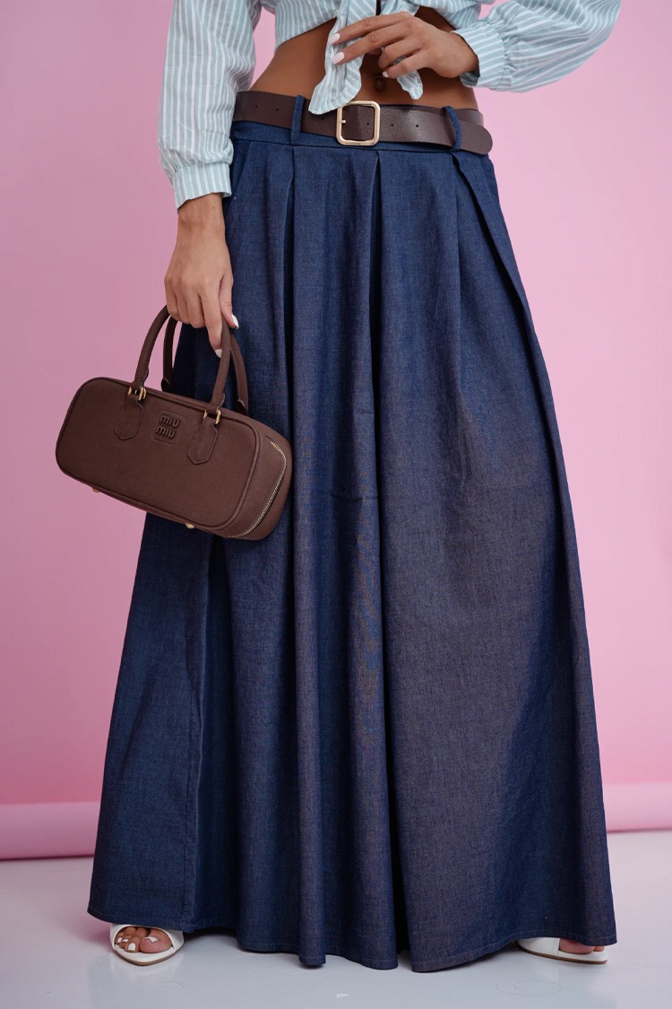 - Modelul are o talie clasică, buzunare, picioare foarte late și o curea din piele ecologică.