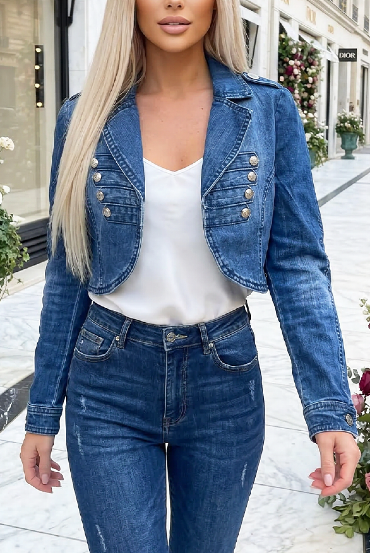 - Pentru un look elegant, alege această geacă de blugi, potrivită pentru orice look.