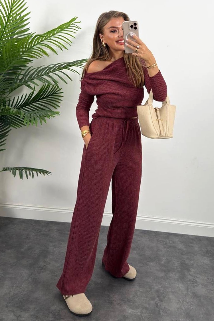 - Bluza are o croială clasică și umeri căzuți, iar pantalonii au un design lejer și talie înaltă.