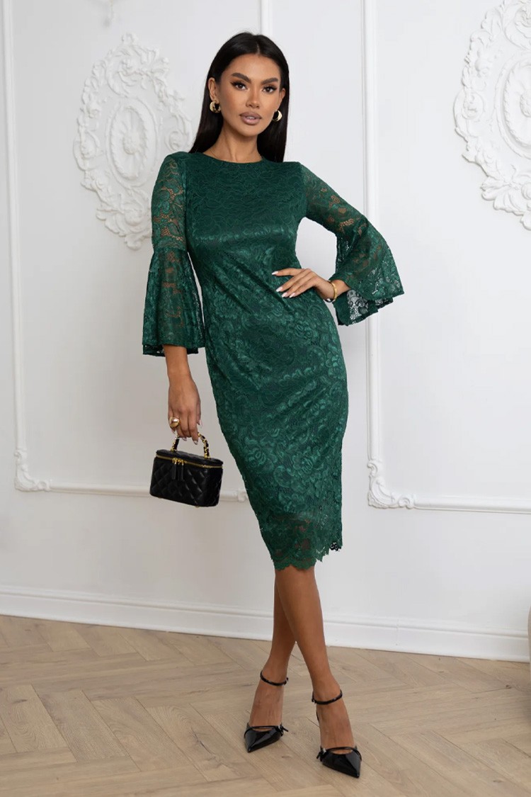 • Modelul are o lungime midi, o croială mulată și mâneci spectaculoase.