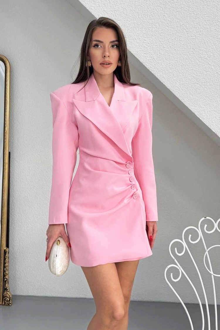 - Alege această rochie scurtă de tip blazer, de culoarea roz - potrivită pentru ținute de petrecere și ocazii speciale.