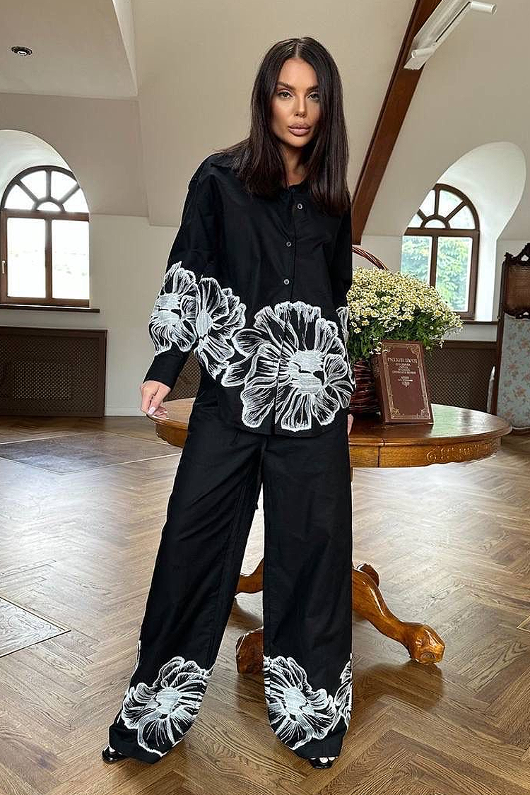 - Pantalonii au o croială lejeră și un imprimeu pe picioare.