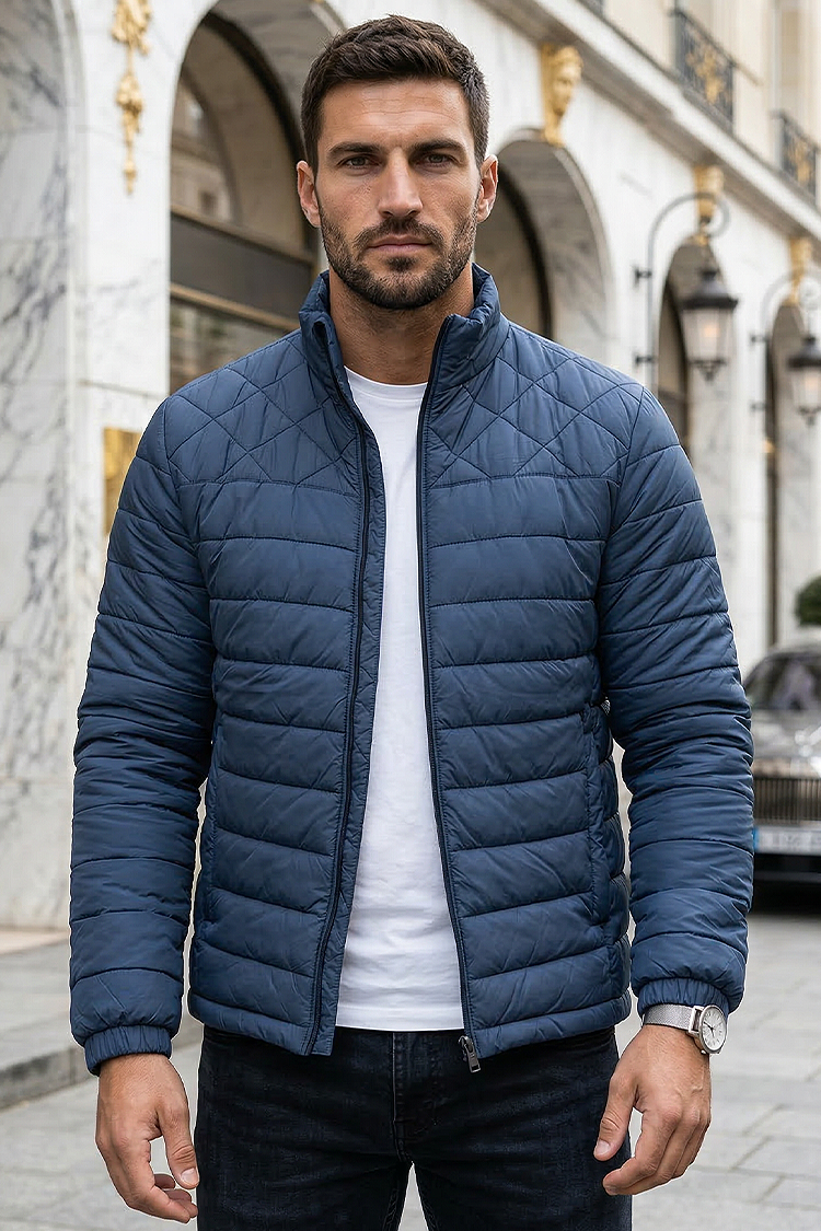 - Geacă pentru bărbăti scurtă și cu un design elegant și curat, potrivită pentru ținuta de zi cu zi.