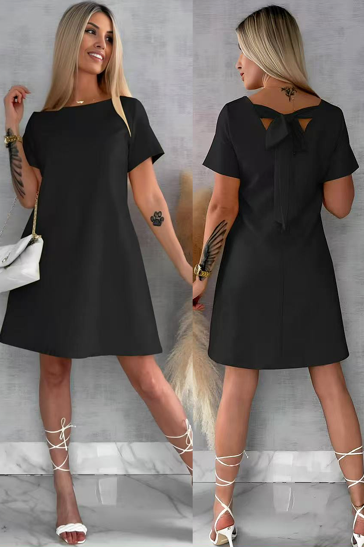 - Rochia are o croială lejeră, mâneci scurte și un accent spectaculos pe spate cu panglică.