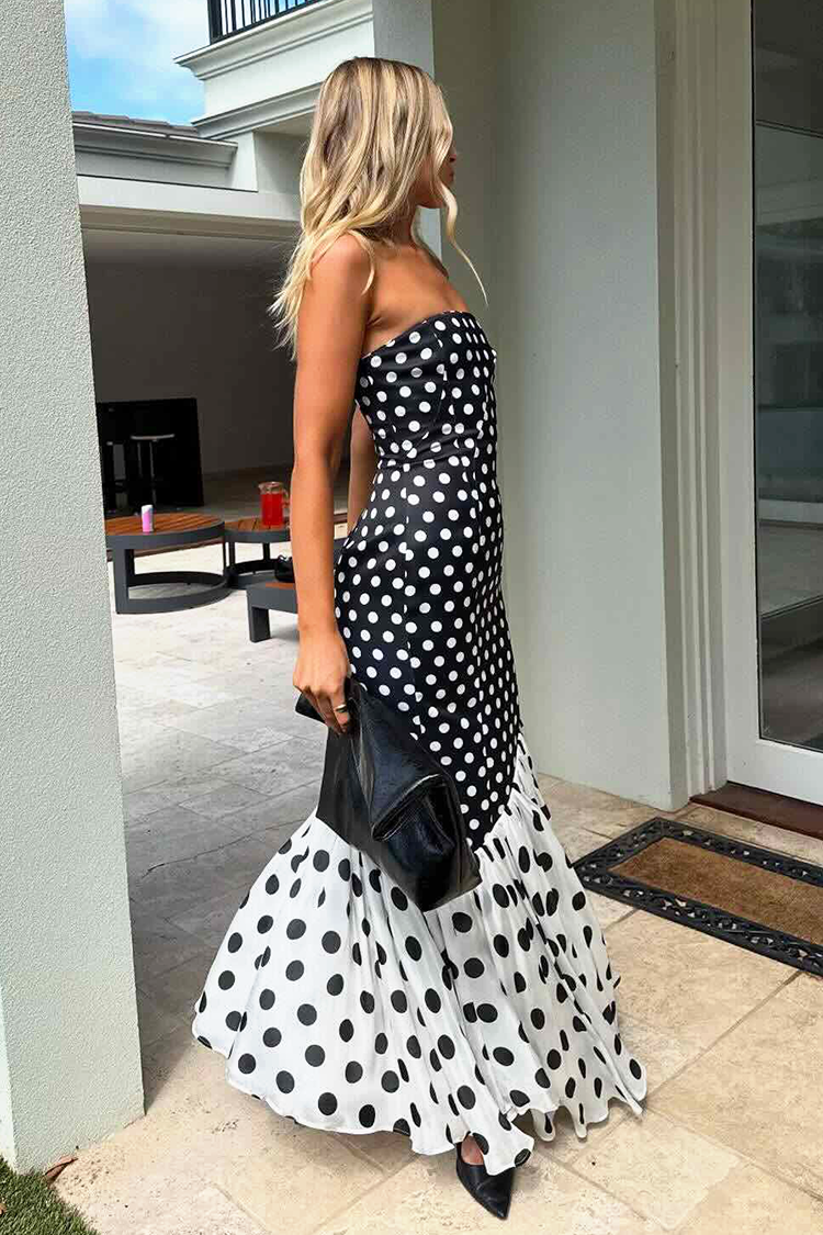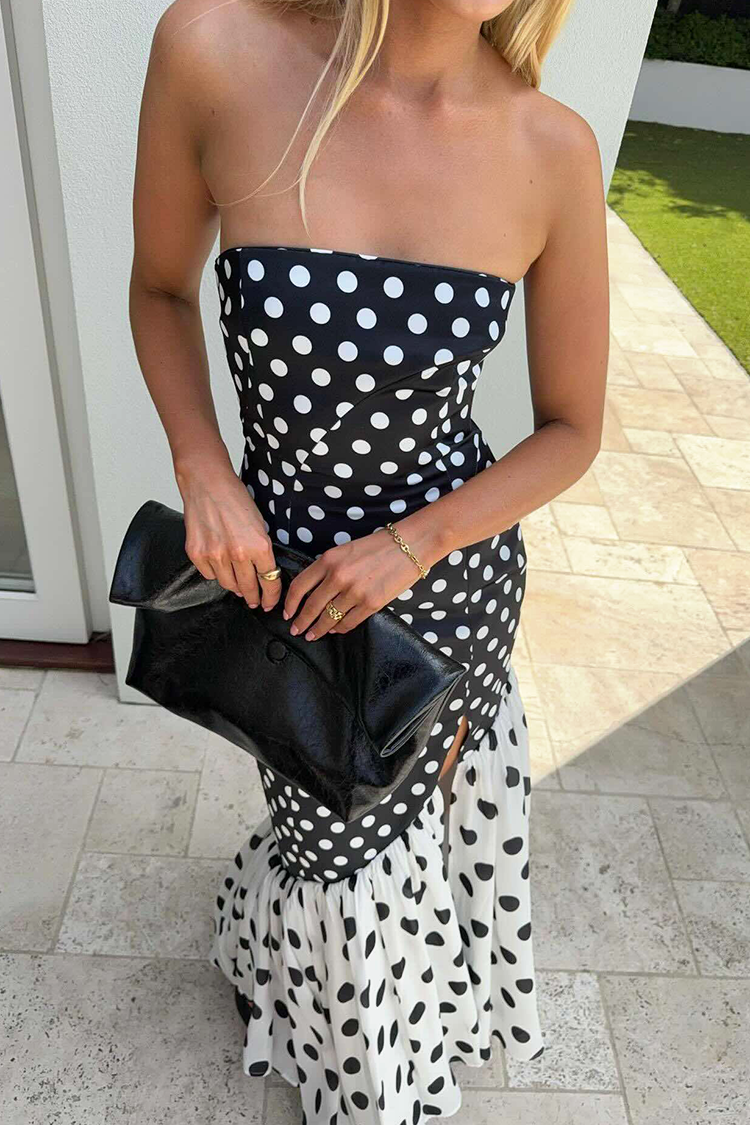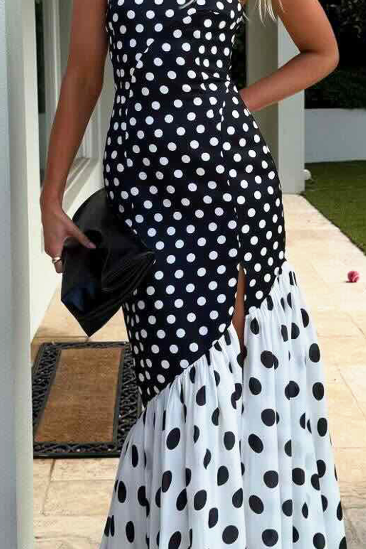 - Modelul are un design elegant, un model contrastant cu buline și o crăpătură sexy în față.