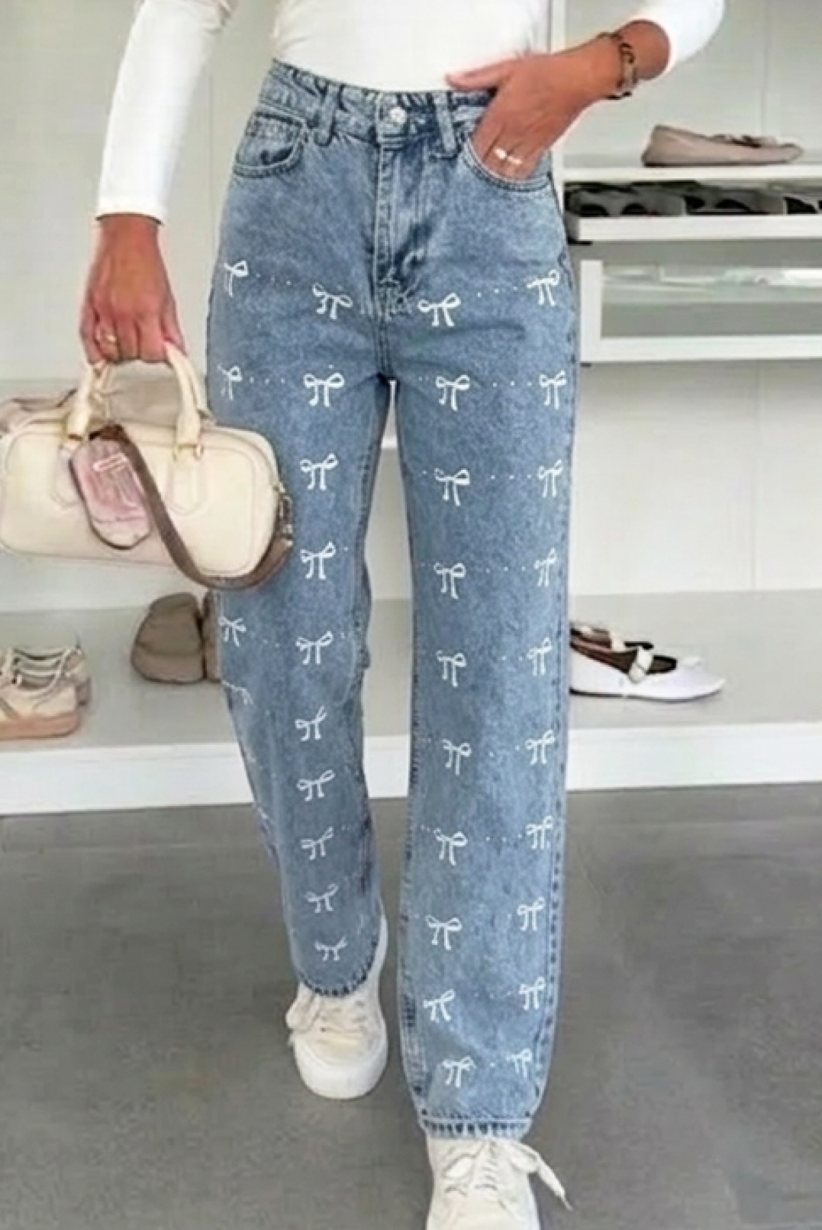 - Modelul are talie înaltă, o croială confortabilă, buzunare laterale și un imprimeu atractiv cu panglici.