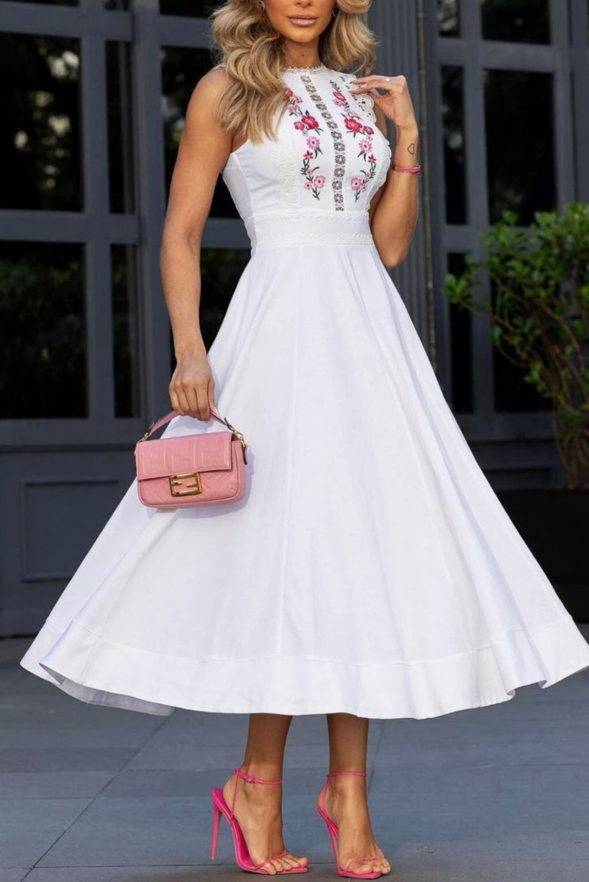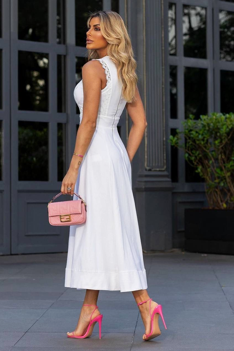 - Modelul are o croială lejeră, fără mâneci, cu un accent spectaculos de dantelă și broderie.