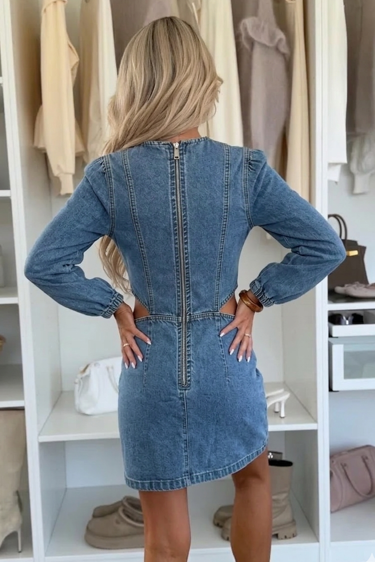 - Pentru un look delicat și la modă, alege această rochie din denim, perfectă pentru viața de zi cu zi.