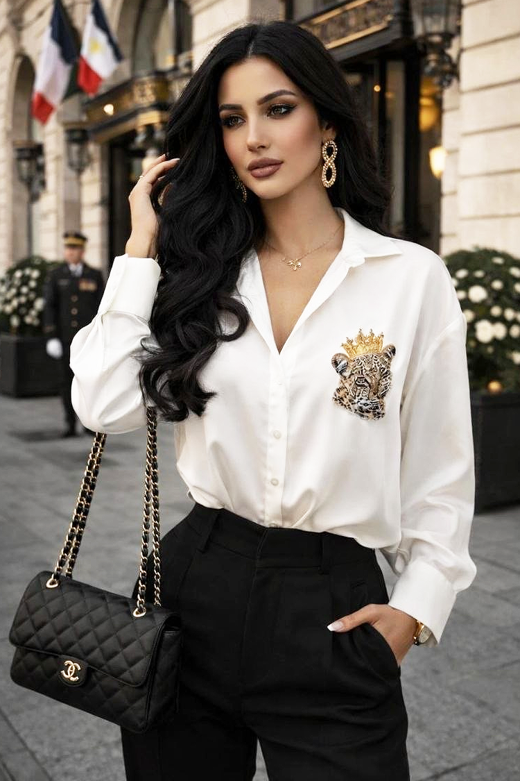 - Cămașă atractivă de damă, de culoare albă, potrivită pentru ținute la modă de zi cu zi.