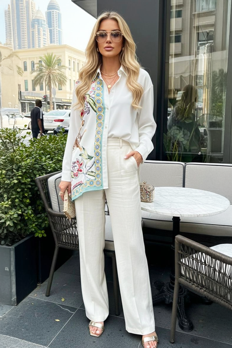 - Cămașă atractivă de damă, de culoare albă, potrivită pentru ținute la modă de zi cu zi.