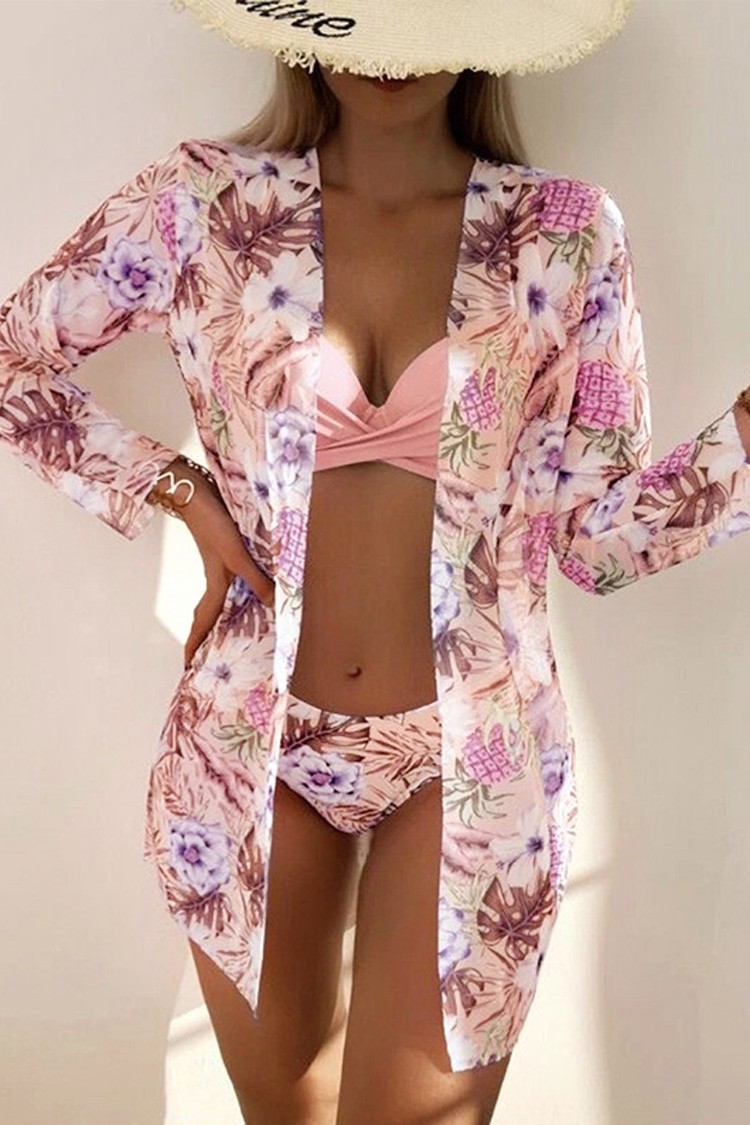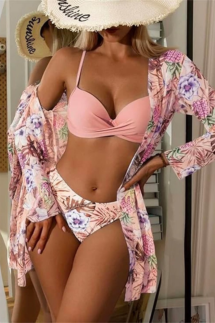 - O alegere excelentă pentru un look elegant este acest set modern de plajă cu model multicolor.