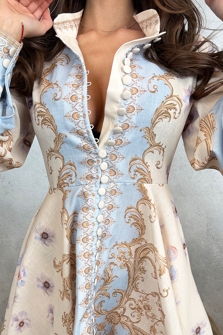 - Rochia are o lungime mini, nasturi pe toată lungimea, guler și un model multicolor.
