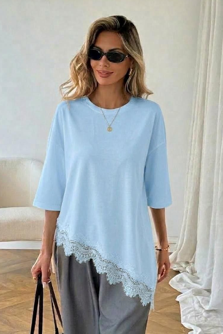 - Modelul are o croială lejeră, asimetrică și o dantelă ajurata spectaculoasă la final.