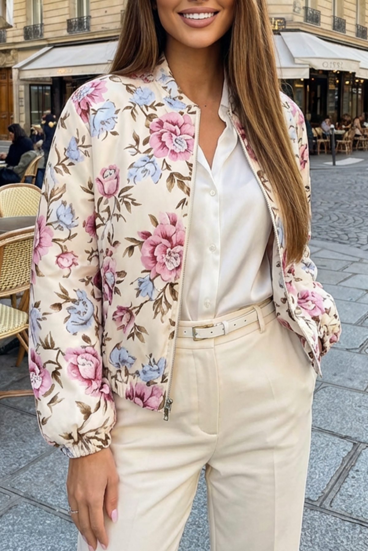 - Modelul are un fermoar pe toată lungimea în față, o lungime scurtă și un model floral spectaculos.