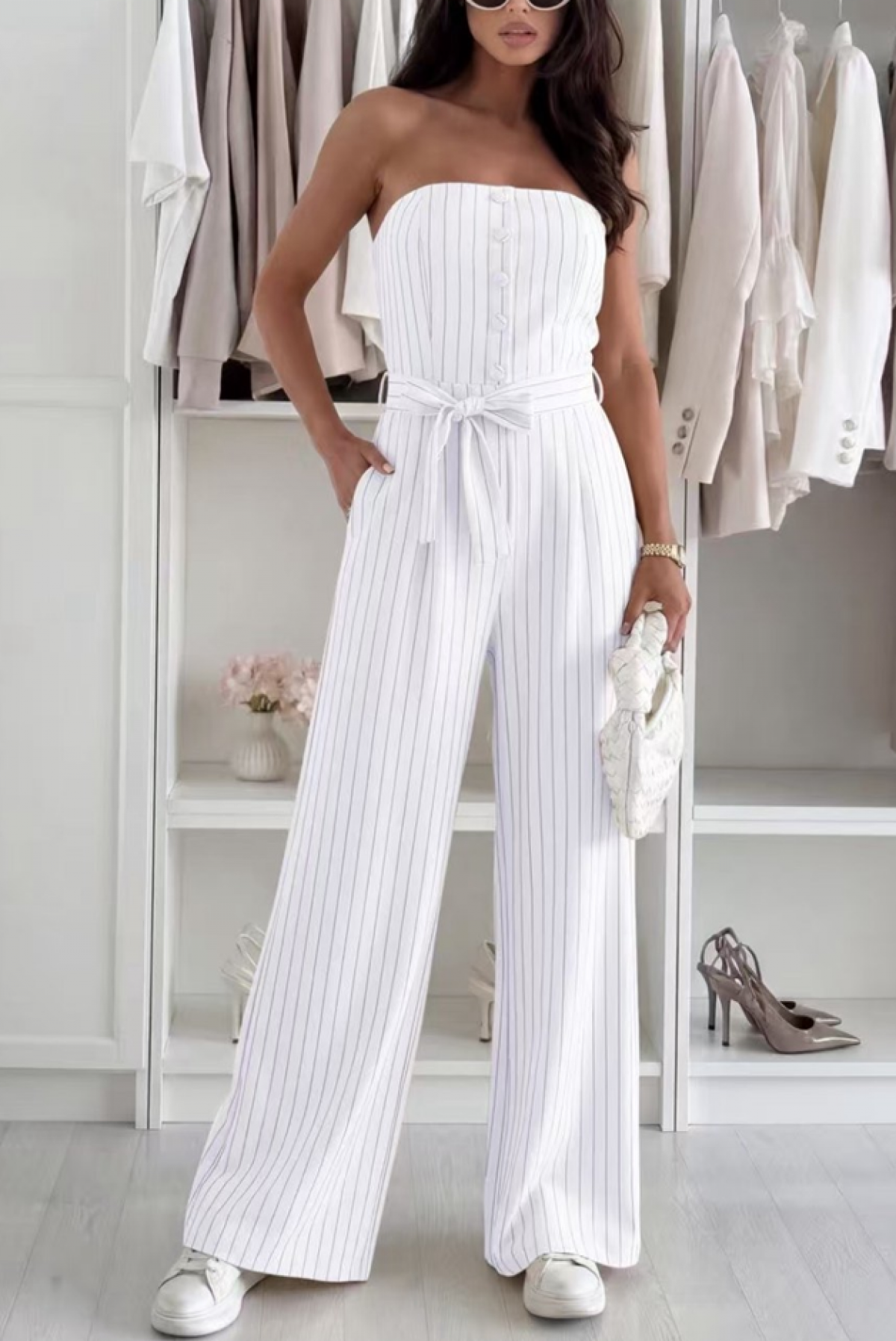 - Modelul are o croială elegantă, picioare late, un decolteu de tip bustiera elegant cu nasturi și o curea în talie.