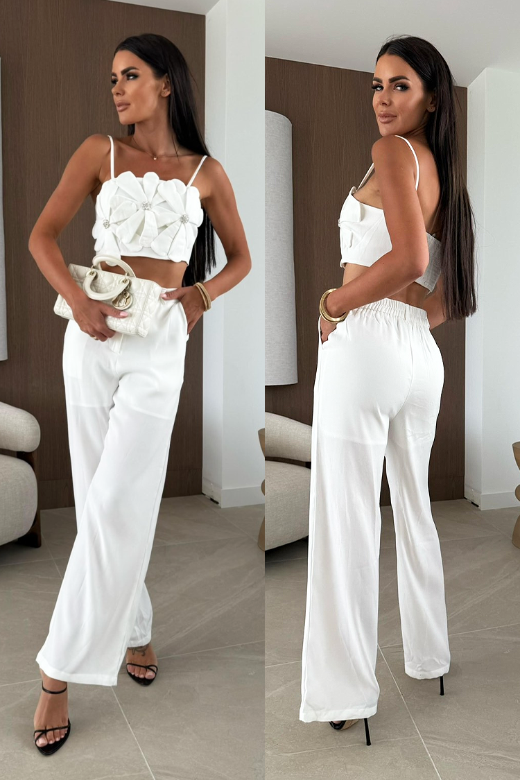 - Partea superioară este un top crop cu flori spectaculoase, partea inferioară sunt pantaloni drepți.
