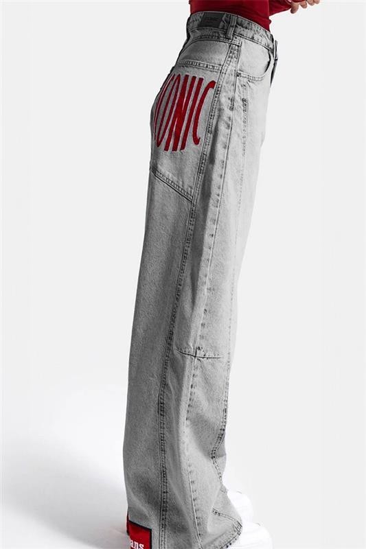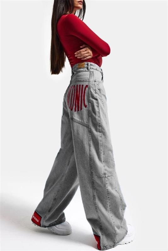 - Modelul are talie înaltă, croială lejeră, model de culoare gri deschis și broderie roșie.