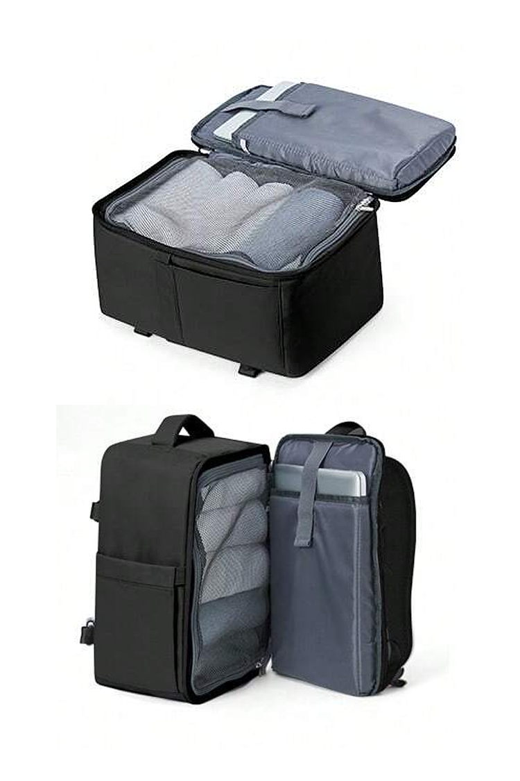 - Un rucsac de călătorie robust și compact, ideal ca bagaj de mână pentru zborurile cu Wizz Air și Ryanair.