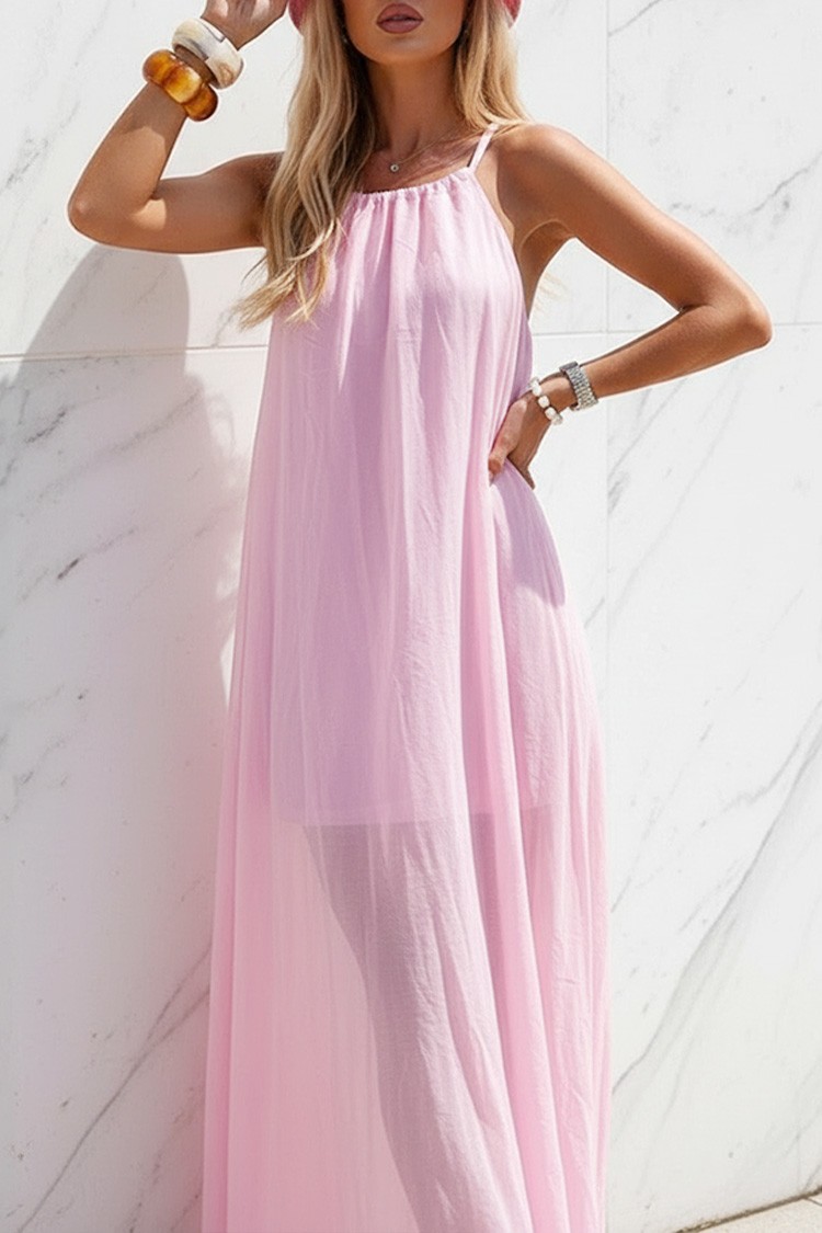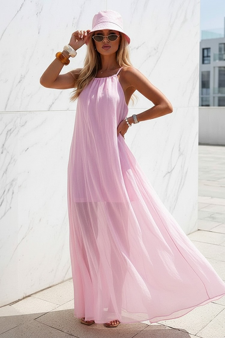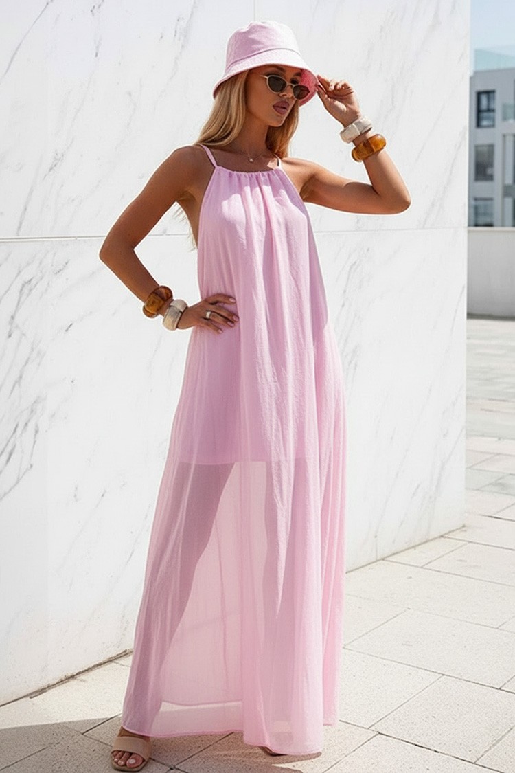 - Pentru un look modern și de zi cu zi, alege această rochie lungă cu un design atractiv de culoare roz.