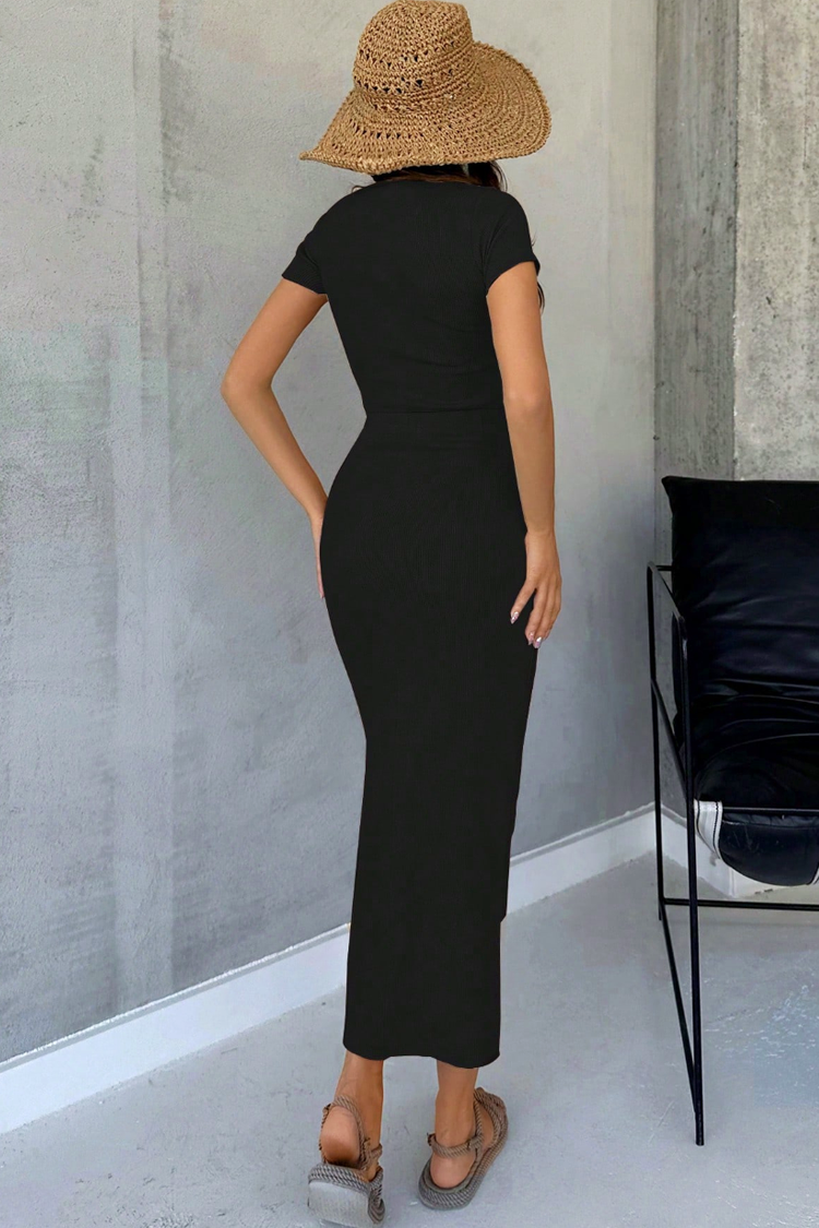 - Topul este scurt cu mâneci scurte, decolteu clasic și design mulat.