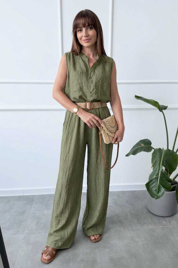 - Cămașă de damă cu o croială lejeră, fără mâneci și cu nasturi pe toată lungimea, oferind confort și eleganță.
