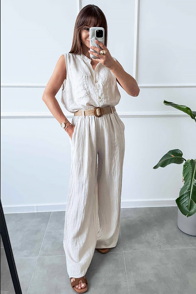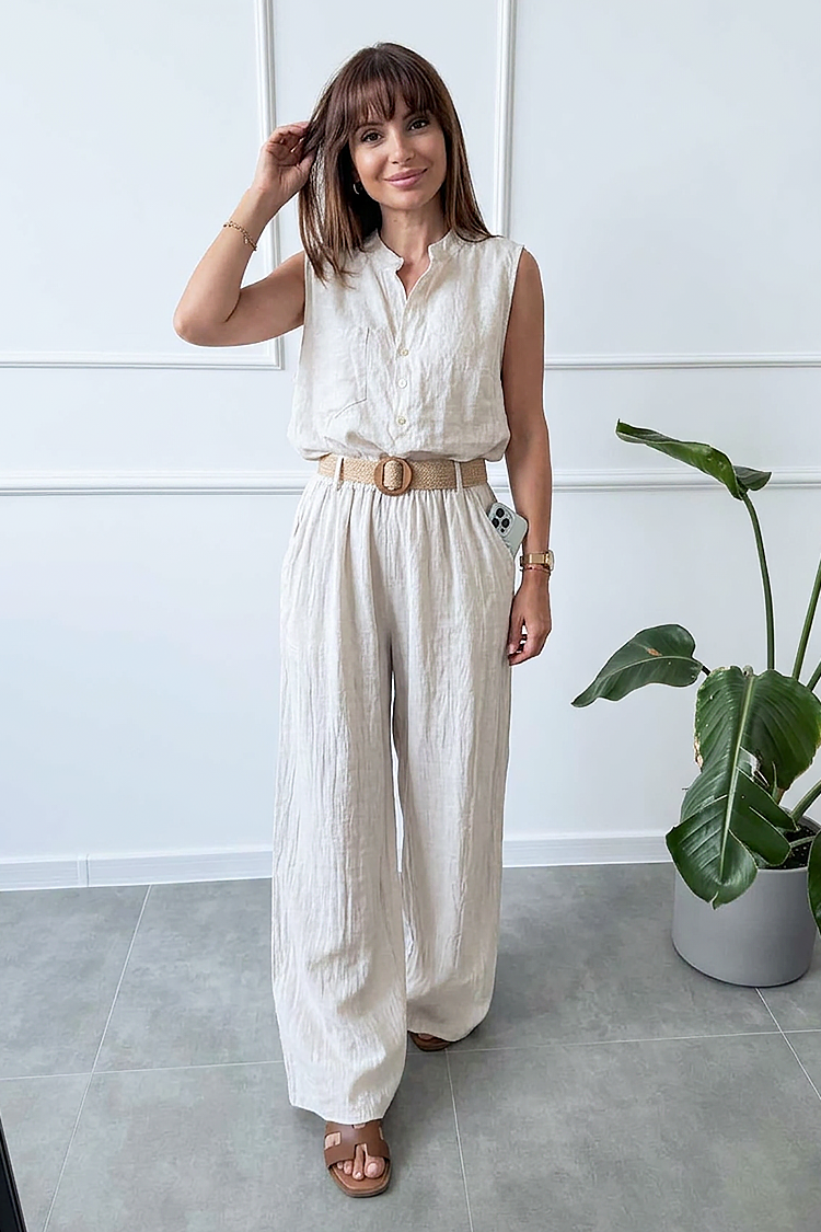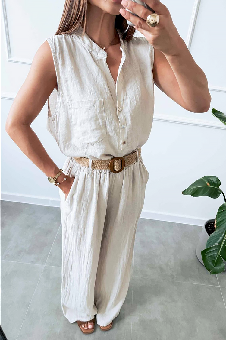 - Cămașă de damă cu o croială lejeră, fără mâneci și cu nasturi pe toată lungimea, oferind confort și eleganță.