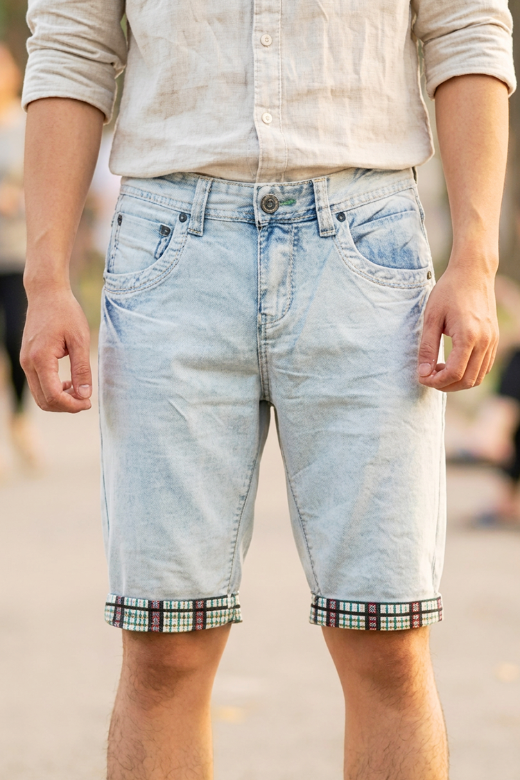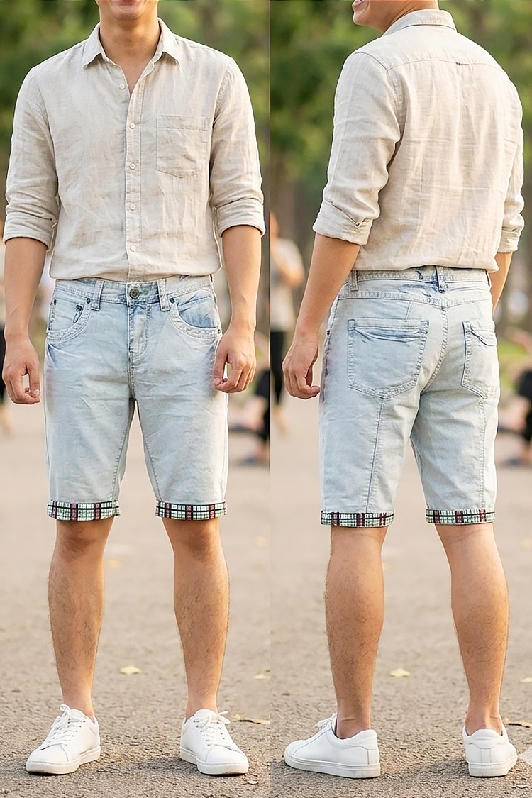 - Model curat de pantaloni scurți din denim pentru bărbați, în culoarea albastru deschis, potriviți pentru diverse combinații vestimentare.