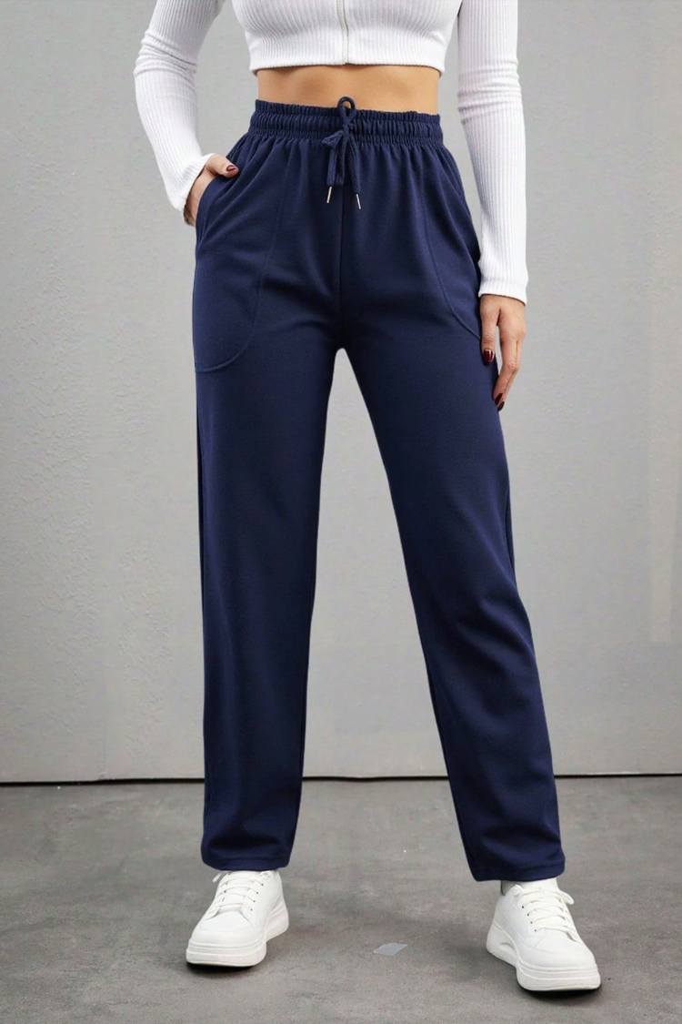 - Modelul are talie înaltă și elastică cu legături, buzunare laterale și o culoare albastru închis.