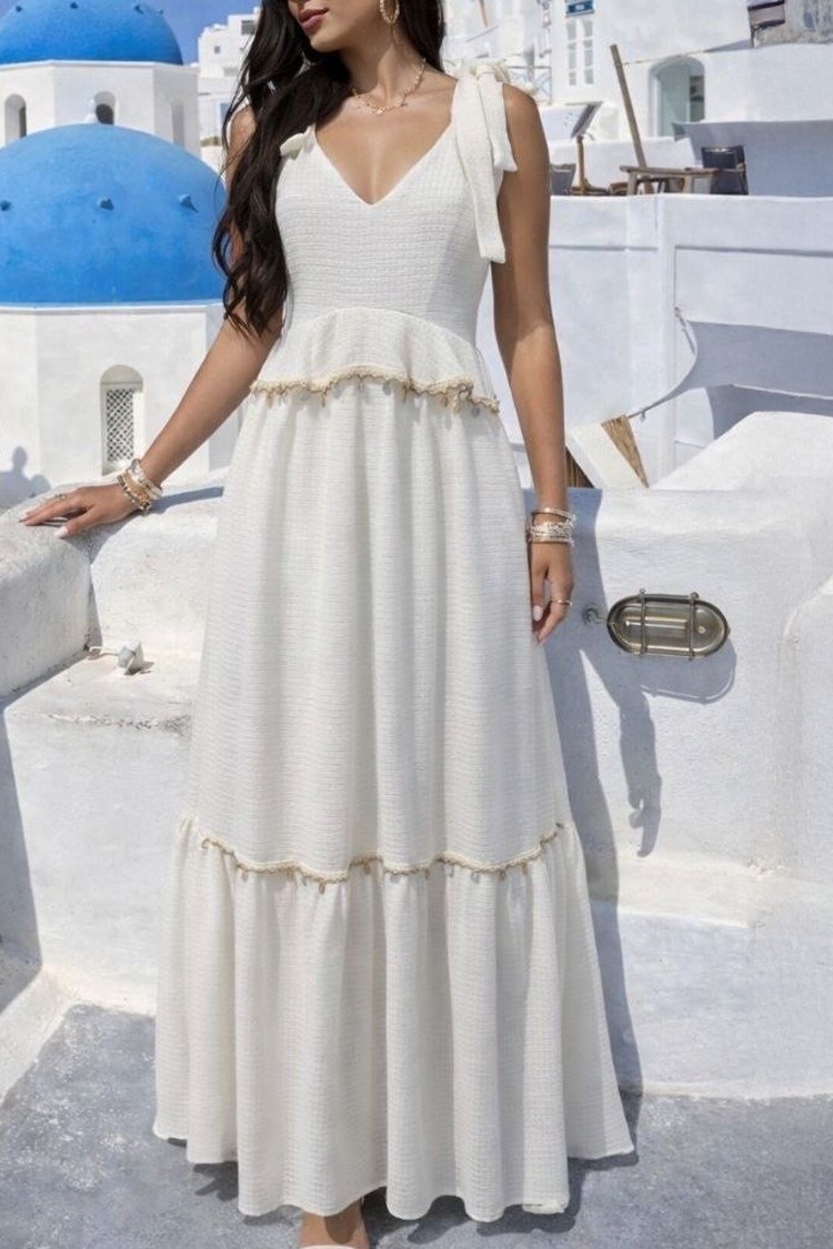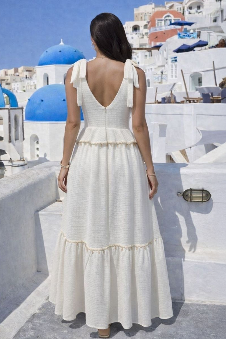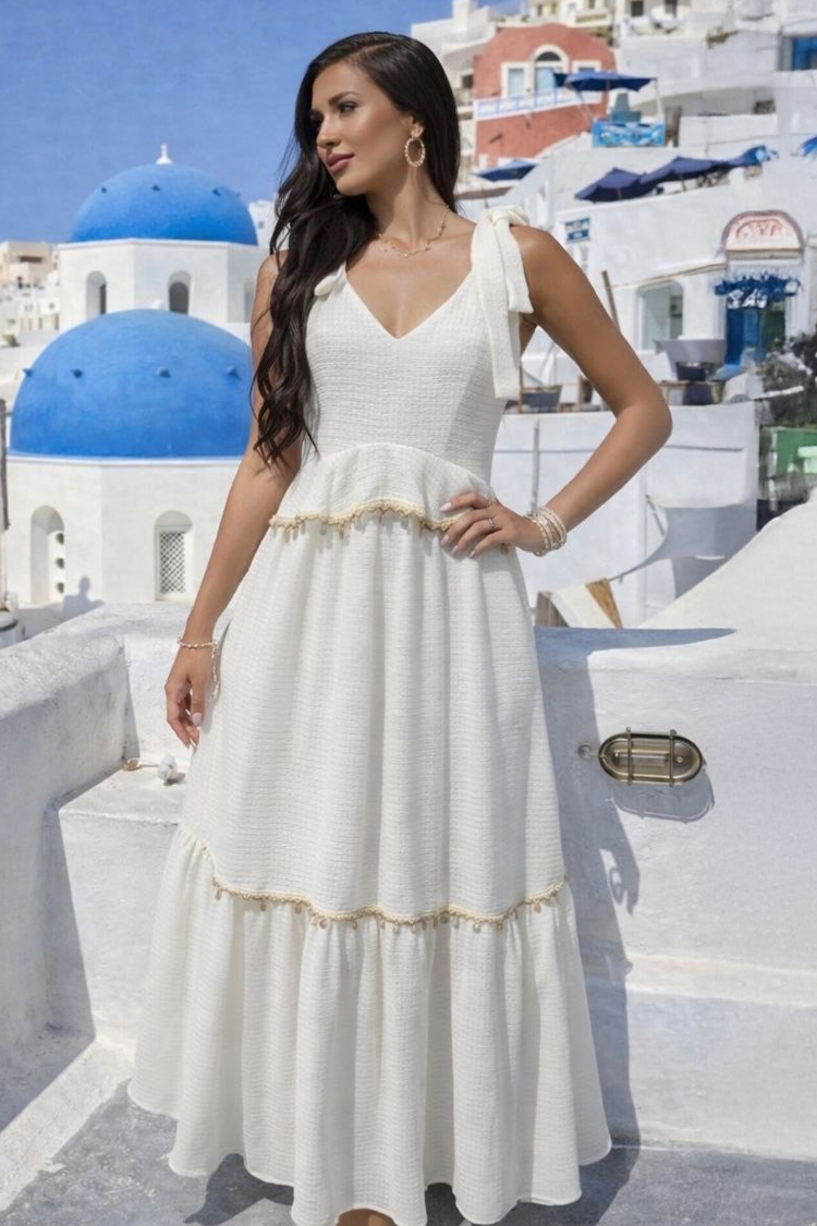 - Rochia are o croială confortabilă și lejeră, bretele cu panglici, decolteu V, volane și o croială evazată.