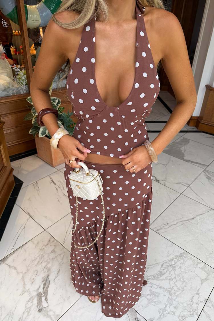 - Topul are o lungime crop, o croială mulată, un decolteu sexy și buline.