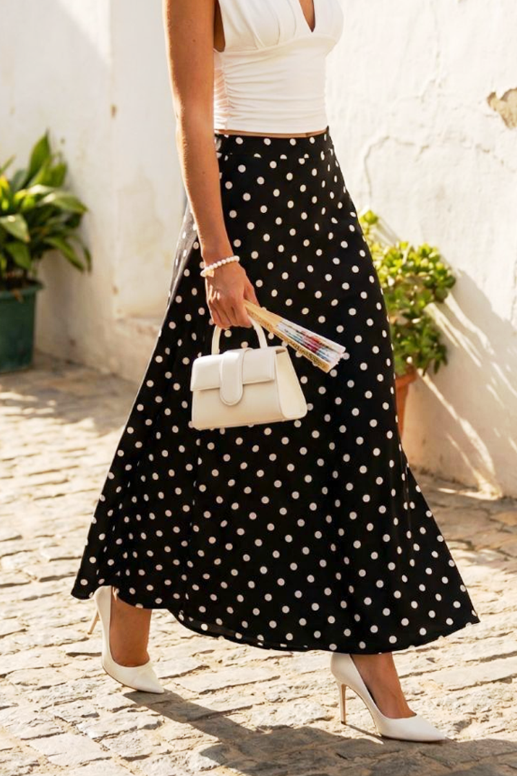 - Modelul are un design evazat, talie medie-înaltă, model cu buline de culoare neagră.
