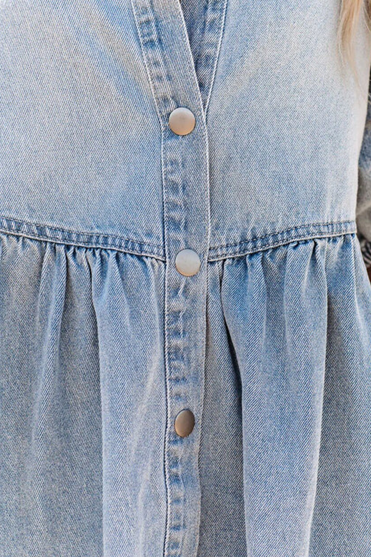 Țesătura moale din denim cade elegant pe corp, iar mânecile ușor bufante și nasturii din față pe toată lungimea conferă un accent modern. Talia delicat strânsă conturează o siluetă feminină, fără a compromite confortul.