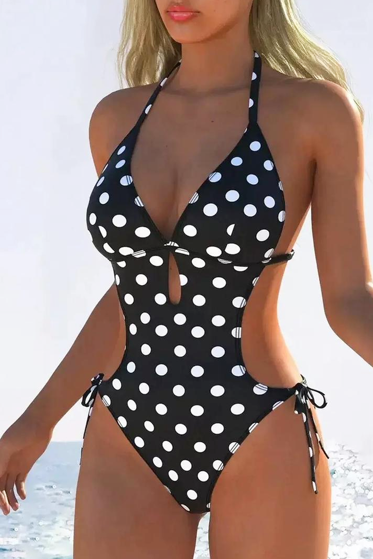 Acest costum de baie este un model provocator și extrem de feminin, care îmbină inspirația retro cu o linie modernă și provocatoare. Imprimeul clasic cu buline albe pe fond negru conferă un șic în timp ce decupajele laterale conturează silueta și creează un efect vizual de talie mai subțire.